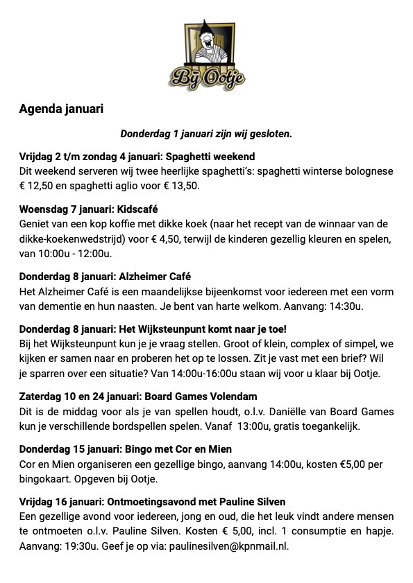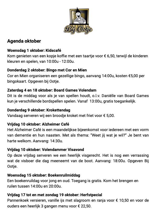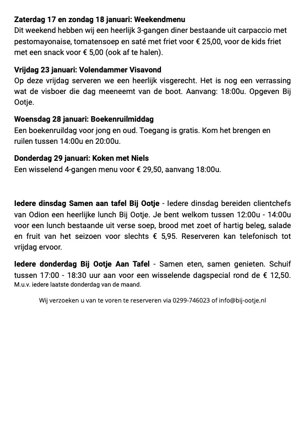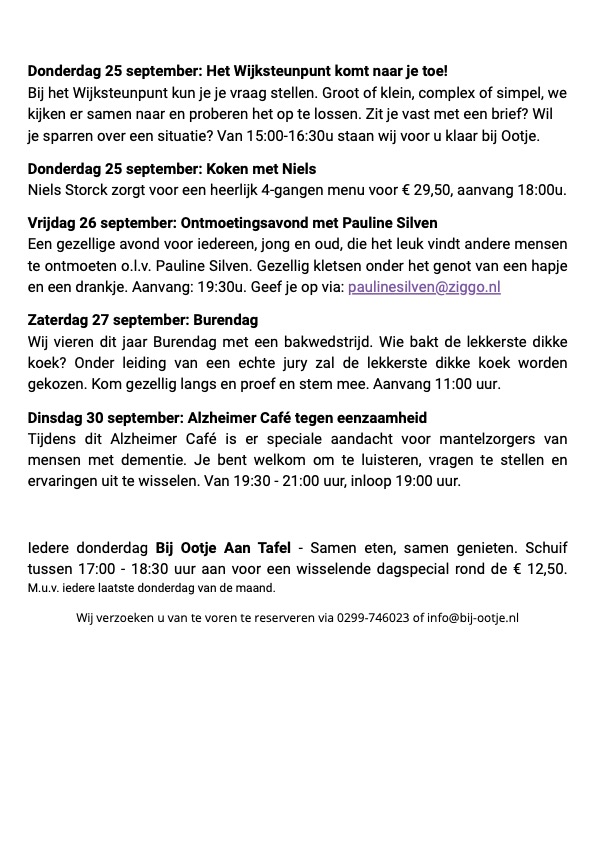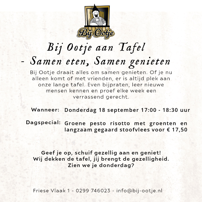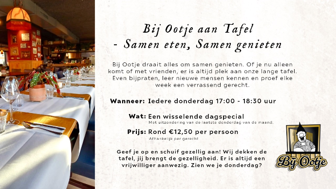 Iedere donderdag gaan we samen bij Ootje aan Tafel. Wij serveren een wisselende dagspecial vanaf 17:00 - 18:30 uur. Geef je op en schuif gezellig aan.