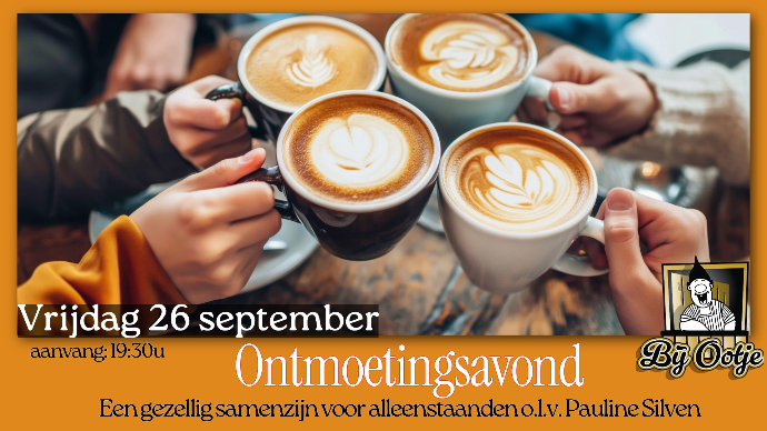 Vrijdag 26 september: een gezellig samenzijn voor alleenstaanden. Aanvang: 19:30u. Geef je op via: paulinesilven@ziggo.nl
