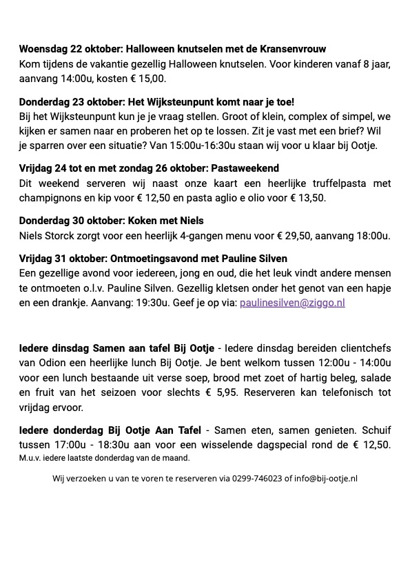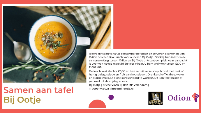 Iedere dinsdag vanaf 23 september bereiden en serveren cliëntchefs van Odion een heerlijke lunch voor ouderen Bij Ootje. U bent welkom tussen 12:00 en 14:00 uur. De lunch kost slechts €5,95 en bestaat uit verse soep, brood met zoet of hartig beleg, salade en fruit van het seizoen. Er dient gereserveerd te worden. Dit kan telefonisch of per mail tot de vrijdag ervoor.