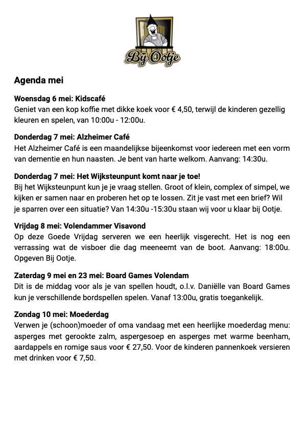 Iedere dinsdag vanaf 23 september bereiden en serveren cliΓ«ntchefs van Odion een heerlijke lunch voor ouderen Bij Ootje. U bent welkom tussen 12:00 en 14:00 uur. De lunch kost slechts β¬5,95 en bestaat uit verse soep, brood met zoet of hartig beleg, salade en fruit van het seizoen. Er dient gereserveerd te worden. Dit kan telefonisch of per mail tot de vrijdag ervoor.
